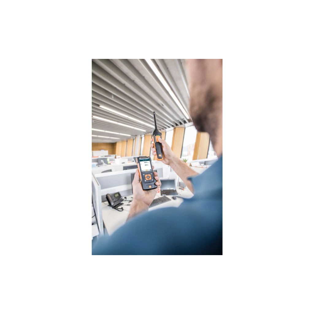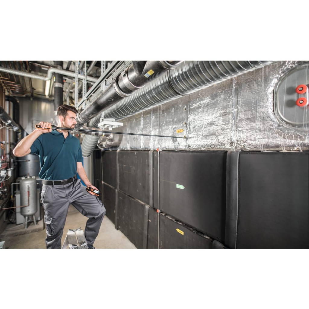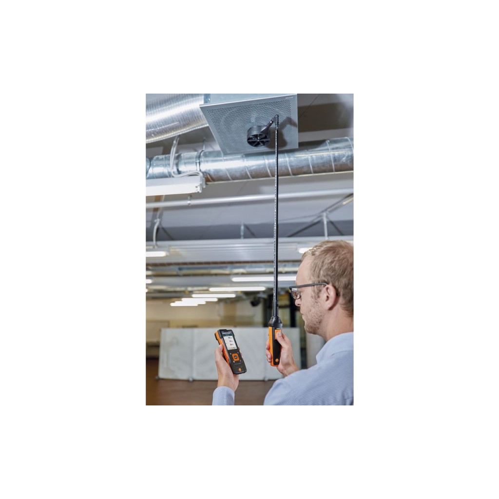 - Per misurare senza fatica nel condotto di ventilazione: il puntale può essere semplicemente collegato alla stabile asta telescopica antitorsione fornita in dotazione (sino a 1,0 m) dotata di scala ben leggibile e all’impugnatura universale Bluetooth