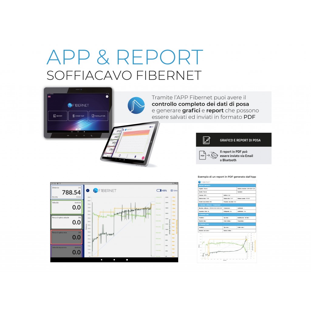 Predisposizione per funzionamento ad aria compressa fino a 16 bar. Trascinamento del cavo assicurato da un sistema a doppia cinghia motrice gommata in modo da escludere possibilità di danneggiamenti della fibra nelle operazioni di posa.